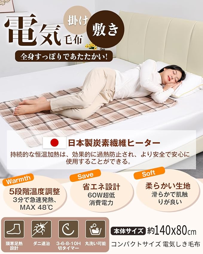 電気毛布 掛け敷き兼用 140 80cm 電気ブランケット 5段階温度調整 4段階切タイマー 速暖 頭寒足熱 ダニ退治 防寒対策 節電 省エネ 防臭 抗菌 丸洗い可 肩掛け 膝掛け 毛玉なし 暖房器具 PSE認証 [日本国内限定商品正規品] (チェック柄)