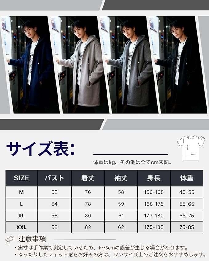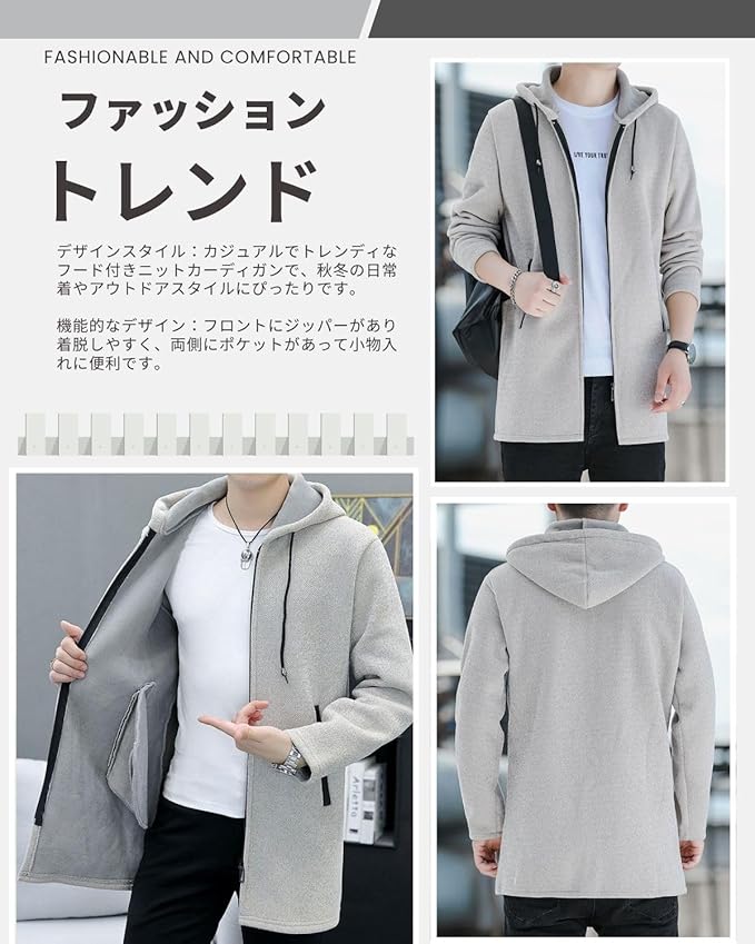 [foveitaa] カーディガン メンズ 秋服 冬服 ベンチコート ロングパーカー ジップアップ メンズ フード付き セーター 大きい サイズ ゆったり 裏起毛 厚手 防風 防寒 暖かい アウター ニット 無地 ジャケット