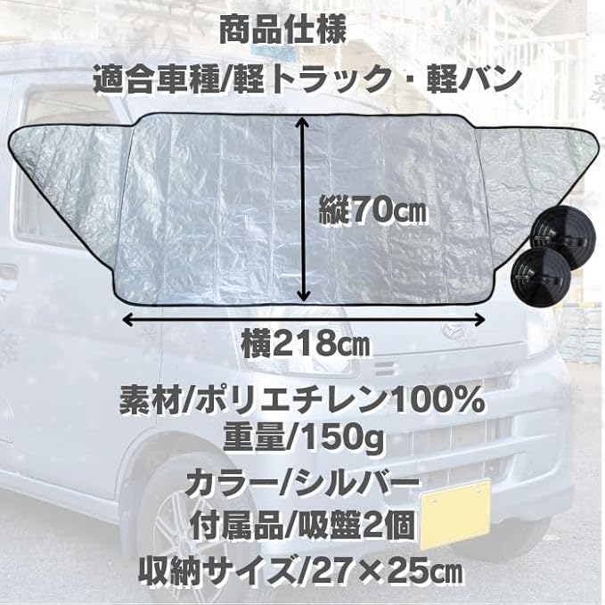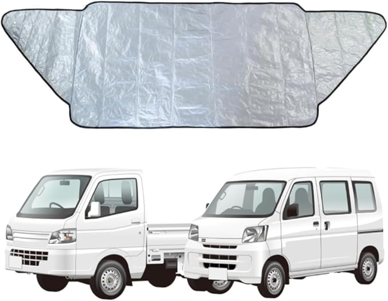 【軽トラック・軽バン専用設計の雪・霜除け、凍結防止用フロントガラス保護カバー】寒い時期の降霜、積雪、凍結、汚れなどからお車のフロントガラスを守るフロントガラス保護カバーです。市販の普通車汎用タイプとは異なり、各自動車HOTの軽トラック(軽バン)に最適な専用設計となります。