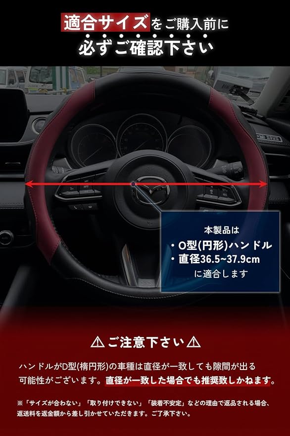 【適用サイズ】円形(通常丸型)36.5~37.9cmに対応。ご購入の際は実際のハンドル直径を測って、サイズをご確認の上ご購入ください。楕円形D型の車種は直径が一致しても、隙間がでる可能性がございます。例え、直径が一致してもおすすめしません。