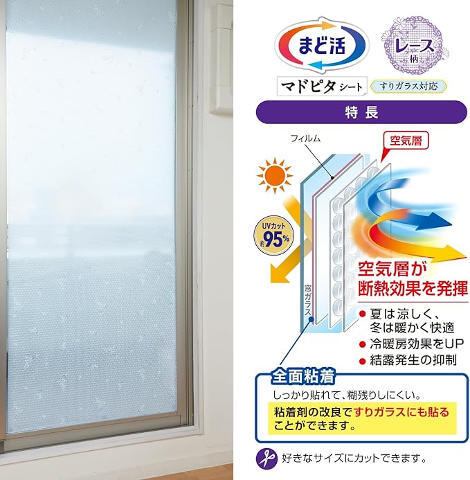 アール(R) 水もテープもいらない マドピタシート (日本製/すりガラス対応/全面粘着) 4層構造で冷暖房効率アップ (UVカット/結露抑制/窓ガラス飛散防止) カット可能 レース 90 180cm H-152