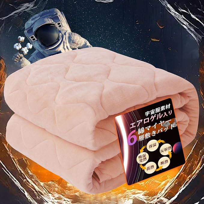 【究極の暖かさを実現する6層構造敷きパッド】究極の保温性能を追求するため6層構造しきぱっどを設計されました:①層目:表側は『接触温感』天然綿100%マイヤータオル地②層目:『速熱・超吸湿発熱』アクリレートわた③層目:『超蓄熱保温』Heatstar-solar蓄熱わた④層目:宇宙級『超断熱』素材エアロゲルわた⑤層目:『冷気遮断・反射熱』アルミシート⑥層目:『爽やか・耐久性』柔らかピーチ。贅沢な素材を6層構造でのデザインにより、接触温感、素速い吸湿発熱、しっかり蓄熱保温、冷気を遮断・反射熱という極暖ループになります。