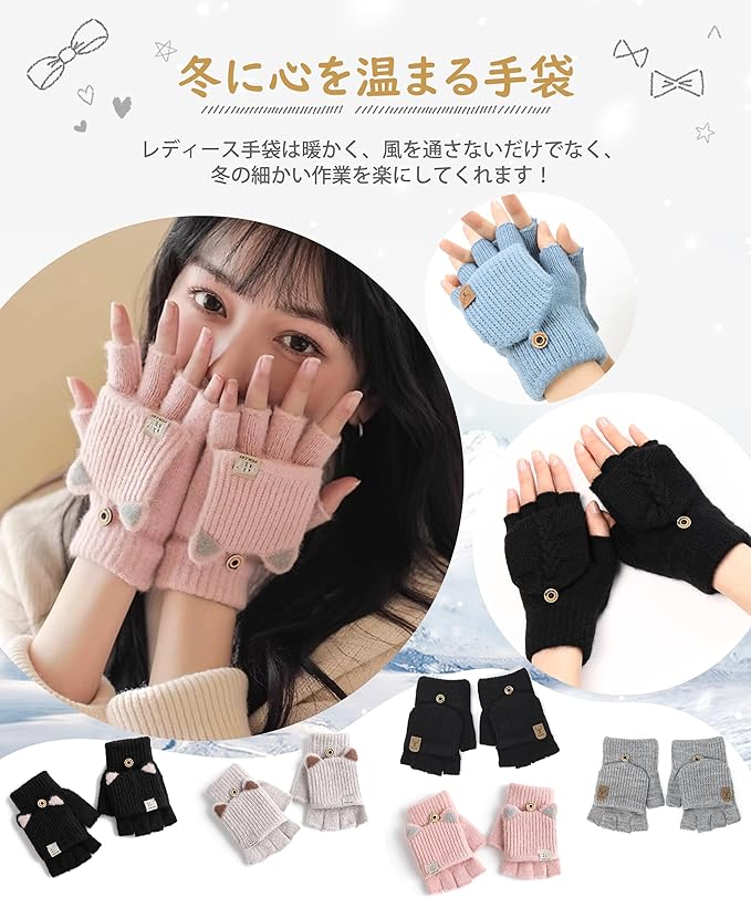 【2WAYで使用が可能】 指なしのレディース手袋デザイン・作業便利:寒い室内では、手が寒さを感じやすいです。オフィスワーカーや勉強が必要な学生は、指なし手袋を使用して問題を解決することができ、邪魔にならず、防寒にも便利で、快適に操作できます!指の半分を露出することで、スマホの操作もしやすく、スマートフォン用手袋としても使用できます! ミトン・360 防寒:寒い屋外では、手の指をミトンに入れて、保温手袋にすることができます。寒さやニーズに合わせて交換できる手袋です。実用性と美しさを兼ね備えた女性用防寒手袋です。