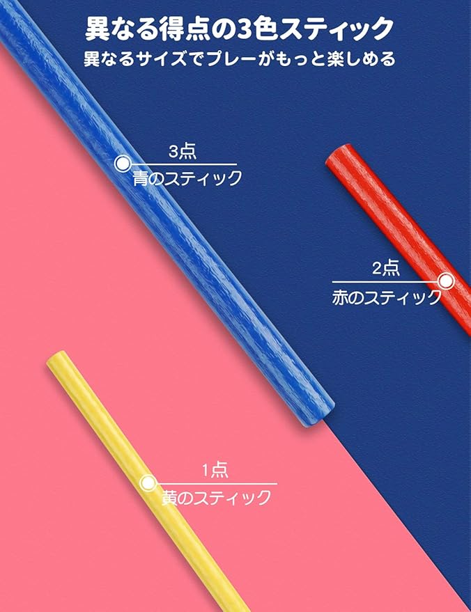 【取り付け方と遊び方】全てのスティックを束にして片手で握り、木の輪を束の上から通して真ん中まで下ろし、ゆっくりと束から手を離してください。全体が動かなくなったら、ゲーム準備が完了です。プレーヤーは順番にサイコロを投げ、全体が崩さないように注意しながら出たサイコロの色のスティックを取り出します。全体が崩したら(または、スティックが3本しか残らなかった場合、)ゲームは終了し、最も得点が高い人は勝ちです。(青1本3点、赤1本2点、黄1本1点、最後にとったスティックの点数は計算対象外です。)