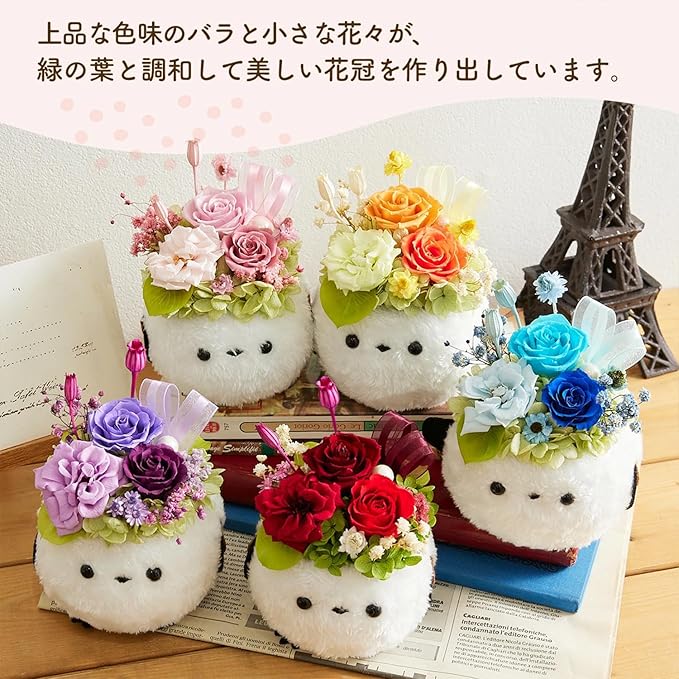 デザイン: 愛らしい白いシマエナガのぬいぐるみをベースに、バラ3種類とアンティークかすみそう、スターフラワーブロッサム、クリスパム、あじさい、ハートリーフ、リボン、パールで華やかにアレンジ