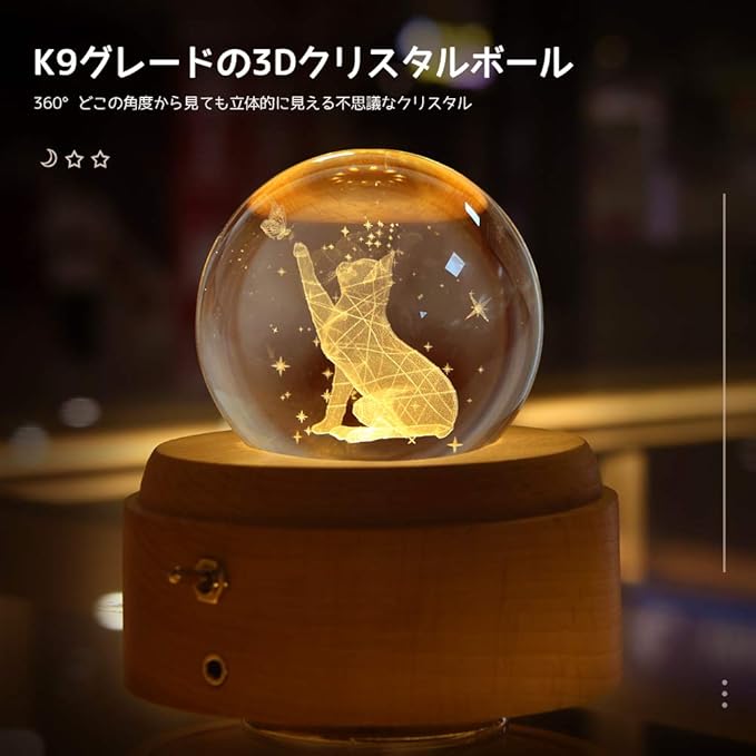 オルゴールはK9クリスタルで作られています。透明で美しい上質なクリスタルボールの内部に、レーザー光線により三次元の「わいい猫」画像を加工しております。芸術的な光と音の彫刻品!いつまでも、変わらぬ音とメロディーであなたの大切な思い出や自分時間をお守りします。曲目:ジブリでは初作品の天空の城ラピュタのテーマ『君をのせて』。