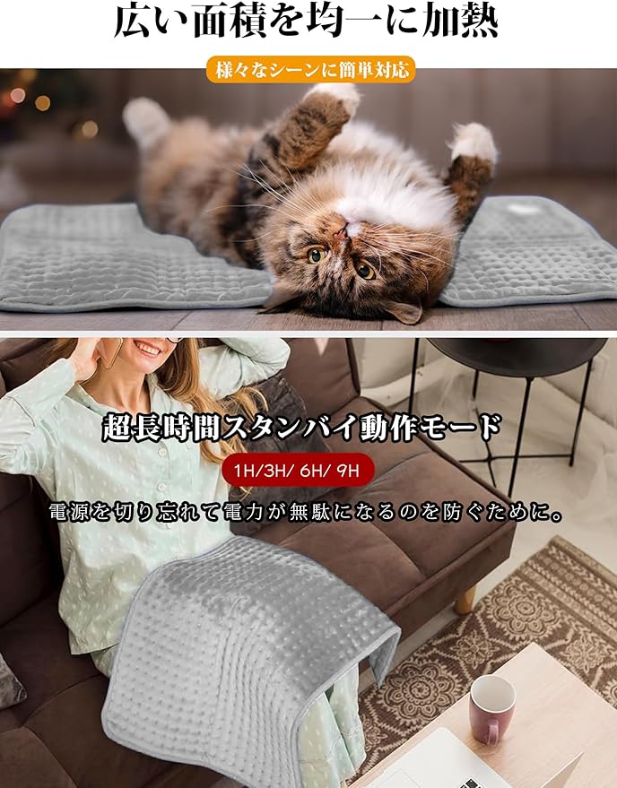 [すばやくヒートアップ] 電源が入ると、2分が経たないうちにほんのり暖かい。暫くすると、かなり熱くなります。丸ごとで洗濯機で洗濯が可能です。ホットマットをお手入れする際は、必ず電源を抜いてください。