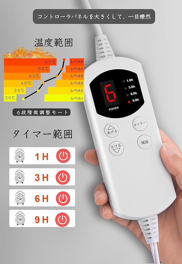 [6段階温度調整できる敷き電気マット] 温度段階を40℃~60℃の6段階に調節できます。温度が60 以上になった場合、長時間で使用すると、皮膚乾燥や低温やけどなどの恐れがあるので気を付けてください。