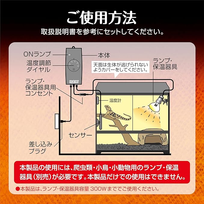 ※本製品は屋内爬虫類・小鳥・小動物飼育専用です。他の目的には使用しないでください。※本製品には必ず爬虫類・小鳥・小動物用のランプ・保温器具(別売)が必要です。※接続する電気器具は、必ず300W以下の器具をご使用ください。※噛み癖のある生体に使用する場合は、センサー・コードを噛まれない位置にセットしたり、市販のカバーをするなど、十分に注意してください。※本体に水滴がかかる場所、直射日光のあたる場所、湿気・ほこりの多い場所、油煙や湯気が当たる場所では使用しないでください。