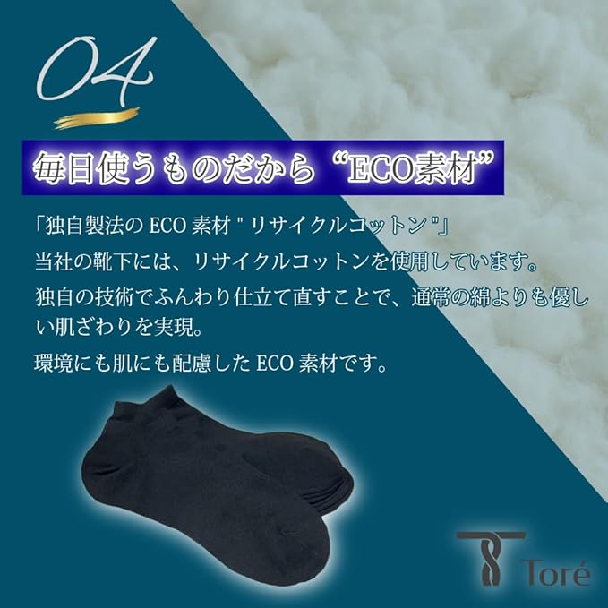 ✅【ECO素材 リサイクルコットン使用】 独自製法でふんわり仕立て直したリサイクルコットンを使用。新品の綿よりも優しい肌ざわりで、環境にも配慮。毎日履く靴下だからこそ、肌にも地球にも優しい選択を。