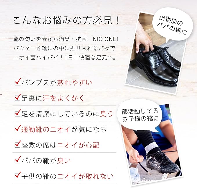 【公的機関での消臭・抗菌効果試験で検査済】本格的な消臭効果があり、足の消臭・防臭・除菌対策が可能な、自然派靴用消臭・除菌パウダー”NIO ONE”40g。
