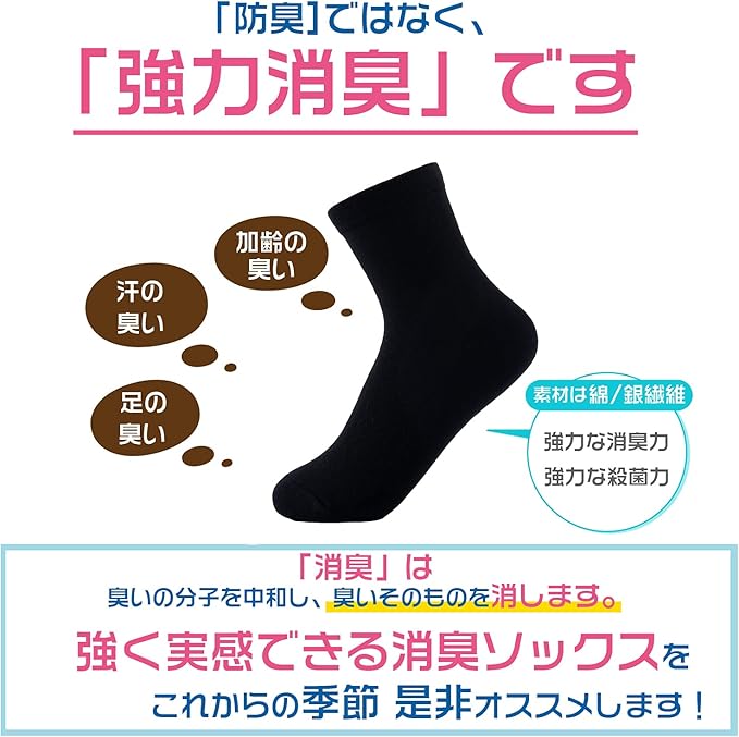 「ニオイの無臭化を実感できます!」綿100%の上質な40番手のコーマ糸を使用。高い消臭性能を持つ40コーマ綿と銀繊維で、短時間に多量のアンモニア臭などを吸着します。