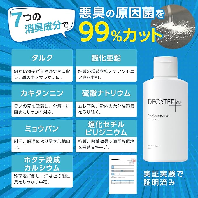 【7つの靴消臭成分】 足元を爽やかに保ちたいなら、この靴用消臭粉がおすすめです。超微粒子のシューパウダーが靴にしっかり馴染み、足の匂いや汗の対策もこれ一本で解決。足の匂い消しや靴の匂い消しをお探しの方にぴったりです。7つの天然由来除菌消臭成分が、靴の中の気になる匂いの元にアプローチし、長時間にわたって効果を持続。さらに、シューズパウダー 日本製ならではの高品質で、足元の潤いを守りながら、抗菌作用も発揮します。継続使用することで最大180日間効果が持続。忙しい毎日でも、快適な足元をサポートする頼れる靴の消臭粉です。