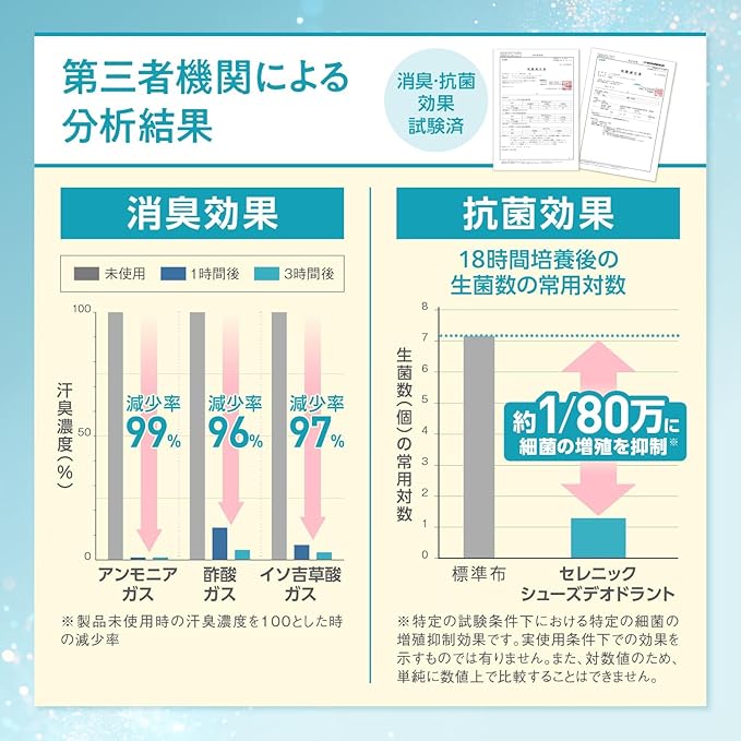 ✅【消臭・抗菌効果を第三者機関で分析試験済】足の臭いの原因となる、アンモニア臭や酢酸ガス、イソ吉草酸ガスの3大悪臭成分を最大99%カット!さらに消臭効果だけでなく、細菌の増殖を約80万分の1まで抑制できる抗菌効果も!強力な消臭・抗菌効果で臭いの元からブロックし、靴の匂い消しや足の臭い対策にしっかり効果を発揮します。