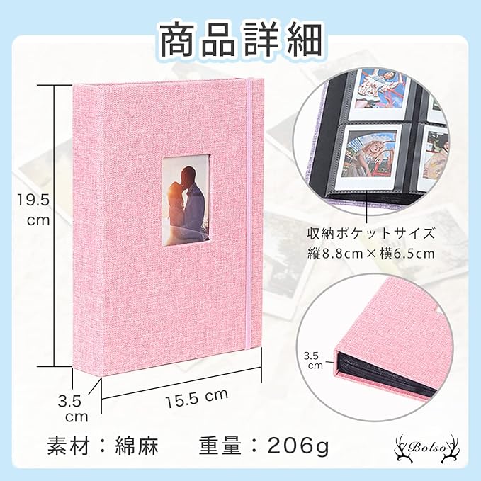 BOLSO チェキ アルバム 大容量 ケース おしゃれ ポラロイド 収納 ファイル ホルダー チェキ帳 フォルダー (ピンク)