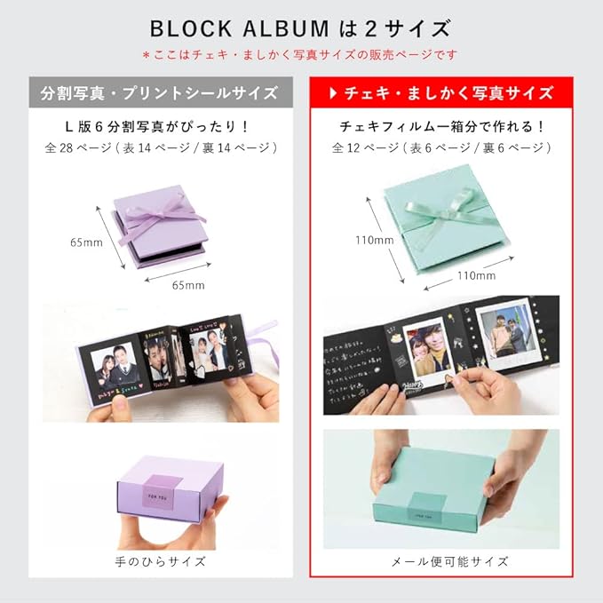 チェキでカンタン! かわいく作れるギフトアルバム 人気の『BLOCK ALBUM』がチェキサイズになって新登場! チェキ 1 箱分がちょうど収まるアルバムです。 チェキプリントや、ましかく写真がぴったり貼れるサイズ。 写真を 10~12 枚貼るだけで完成です。 写真のまわりにシールを貼ったり、ペンで書き込んだり、 ちょっとしたアレンジをするだけで、かわいいアルバムが作れます。 表紙はリボン付きでボックスに入っているので贈り物におすすめ! そのままプレゼントできちゃいます♪
