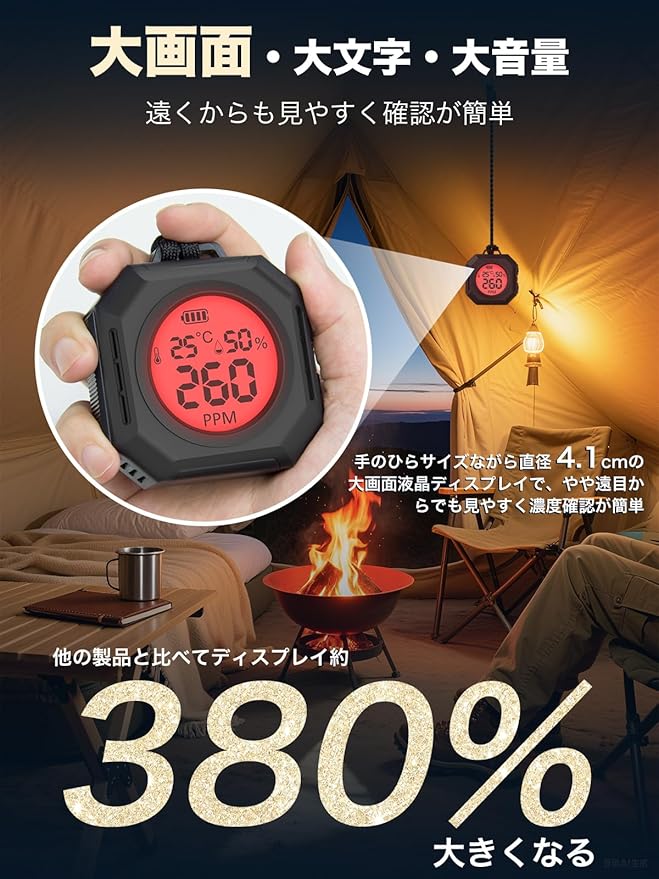 【3in1高性能COチェッカー・アウトドア安全設計】2025年進化モデル。一酸化炭素チェッカーは一酸化炭素濃度・温度・湿度を同時に高精度測定できる3in1仕様。アウトドア環境特化チューニングにより、湿気・冷気・結露が多い日本のキャンプシーンでも安定稼働。※本製品を室内用の一酸化炭素警報機ではございません。
