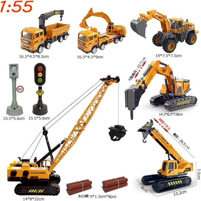【1:55の割合の建設車両】細部と装飾は現実の作業車両の外観を模倣しています。6台の大人気な工事カー、交通カメラ、交通信号灯、8本木の棒、収納ボックスを含めて、豊富で、子供は喜んで遊べます。車両は慣性前進の機能を持っています。魅力アップ!