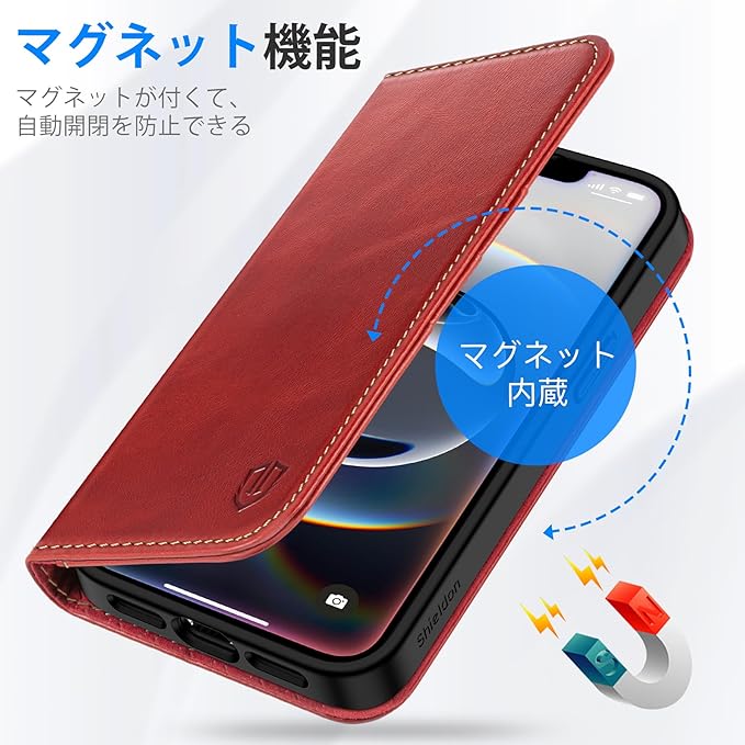SHIELDON iPhone 16e対応ケース 本革 手帳型 アイホン16e用 スマホカバー 衝撃吸収 TPU素材 カード収納 横置きスタンド機能 マグネット内蔵 [RFIDブロッキング] 全面保護 あいふぉん16e 対応スマホケース 2025年発売 6.1インチ 5G レトロレッド