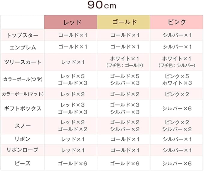 【備考】組立品 ※幅、奥行はおおよそのサイズです。枝の広げ方によって異なります。高さは床からトップスターまでの長さです。 ※2022年8月10日より、リモコンと一部オーナメントの仕様を変更いたしました。※ツリー本体は全カラー共通です。