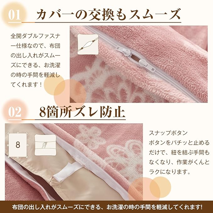 【1枚で2役!季節を問わず大活躍】 冬は温かい掛け布団カバーとして使用でき、布団を外せばふんわり毛布として早変わり。1枚で2通りの使い方ができるため、収納スペースの節約にもなり大変お得です。 8か所に付いたスナップボタンが、布団のズレを防いで快適な寝心地をキープし、全開ファスナーにより簡単に布団の出し入れが可能。 季節の変わり目や洗濯時にもサッと着脱できる、便利な設計です。