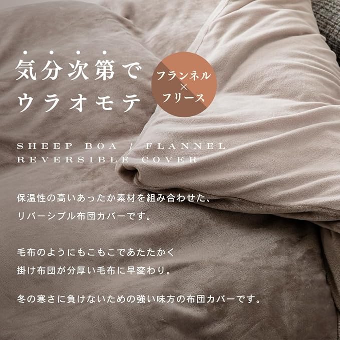 片面フランネル生地、反対面はフリース生地を使用したリバーシブルに使えるあったか仕様の2WAY掛布団カバー。