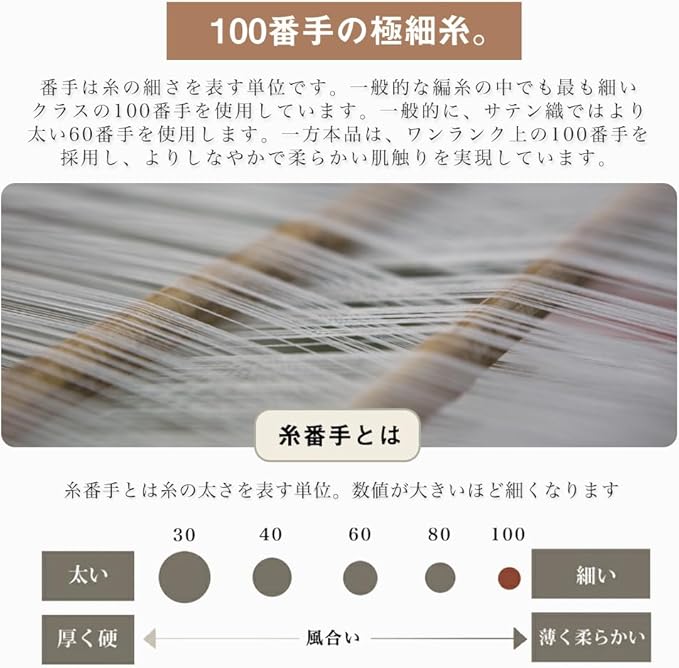 【掛け布団カバー シングルサイズ素材】:綿 100%。良質で高価な100番手双糸の超極細糸を使用し、打ち込み本数は400本です。シングルサイズ-150 210cm