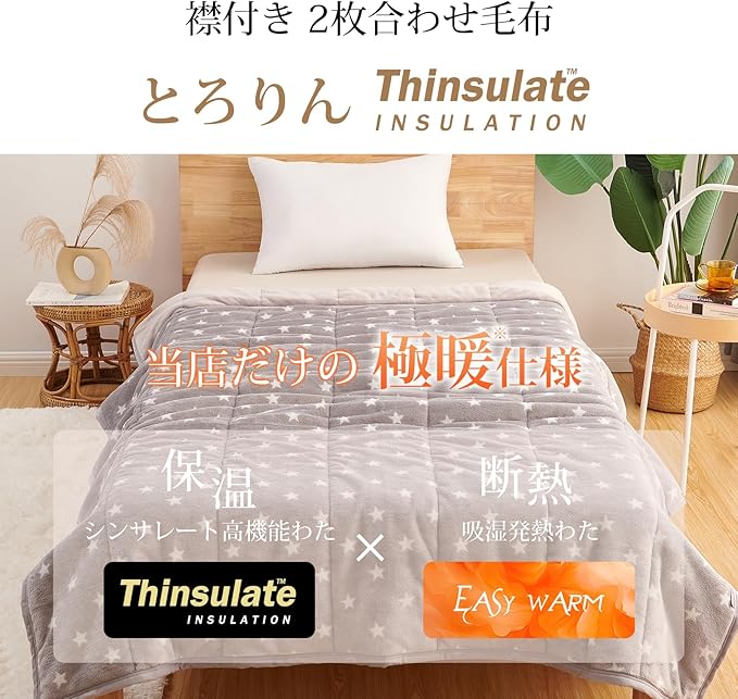【4層構造で保温力倍増!】上層と下層はなめらかな肌触りのフランネル毛布で、その間にシンサレート綿と吸湿発熱中綿を挟んでいる。2枚合わせのサンドイッチ構造だから優れた断熱効果があり、保温性もより良い。保温力たっぷりの冬用毛布!