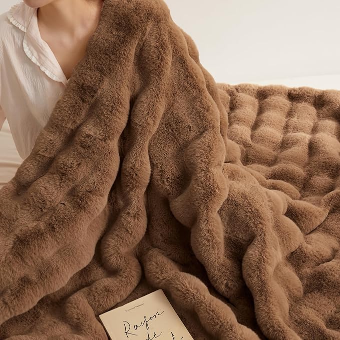 【二枚合わせ毛布、保温性アップ!】本毛布は表裏側全部上質のラビットファー調生地:表側は長めの極細繊維、内側は短めの極細繊維で仕上げており、高い保温性と、ふんわりとした極上の肌触りを両立しました。おしゃれなデザインで、日々のくつろぎタイムを温かく彩ります。