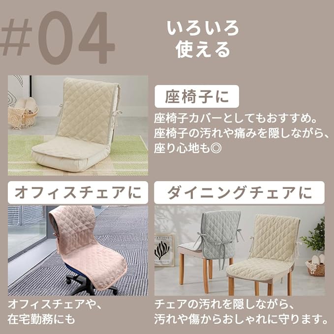 【装着しやすい。】チェアカバーを、被せてサイドと、腰の部分の紐を結ぶだけで簡単に装着出来ます。サイドの他に腰の部分にも紐があるので、椅子から浮きにくく、ぴったりフィットします。また、紐も切れにくいです。