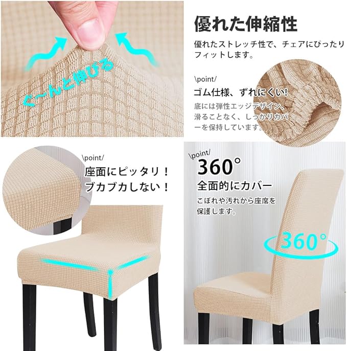 【撥水素材】ポリエステル+ポリウレタンの撥水性素材で作られ、高い耐久性を持ち、撥水機能も優れています。高密度で、水や飲み物が椅子についても弾くものなので、濡れにくくなります。 ストレッチ性 ※水量が多い場合には生地に水が染み込むなど、撥水効果が薄れます。 優れたストレッチ性で、チェアにぴったりフィットします。一人でも簡単に取り付けます。座面までピッタリ!ブカブカしない!