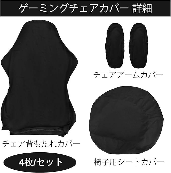 ゲーミングチェア カバー オフィスチェアカバー 黒 チェアカバー 洗える ゲーミングチェア カバー 座面 背面 アームカバー 事務椅子カバー 背もたれ フルカバー 伸びる