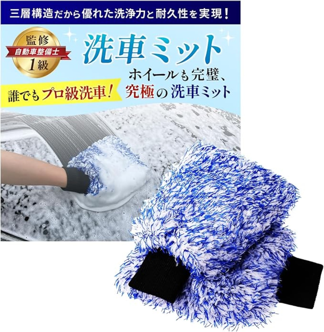 洗車 ミット グローブ 【自動車整備士監修】 マイクロファイバー 洗車ミット 洗車グローブ 【三層構造だからクリーミーな泡立ちで愛車を傷つけない】 ホイール カーウオッシュ スポンジ (ブルー2枚)