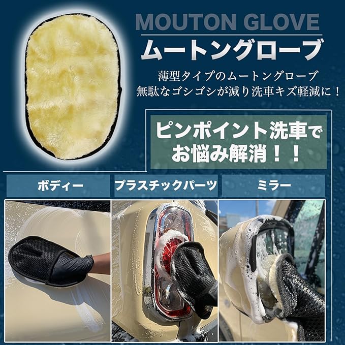 ✅【ムートンファイバーグローブ】:柔軟なミット形状が手の動きに自然になじみ、ボディの曲面やドアミラー周りにもピタッとフィット。高密度のふんわり繊維が汚れを包み込み、ムラなくやさしく洗い上げます。スポンジより操作しやすく、初心者でも扱いやすい使用感を目指した洗車用グローブです。