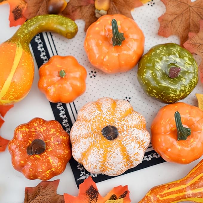 【 本物そっくり高品質素材】各パックには異なるサイズのカボチャなどが入っており、祝日と季節の要素でいっぱいです。フェスティバルや集まりの場に心地よく幸せな雰囲気を演出します。それらはまるで庭から採れたかのように見え、実物そっくりで腐敗することはありません。一度手に取ってみると、まとめて飾るとハロウィンや秋の雰囲気がたっぷり楽しめます!