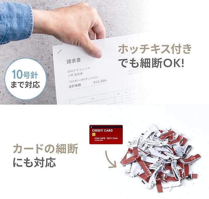 ホッチキスを外さず、10号針付きの書類もそのまま細断でき、プラスチックカードや紙製カードの細断にも対応しており、カードはカットサイズ約4 50mmで処理されます。