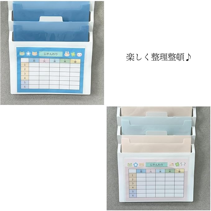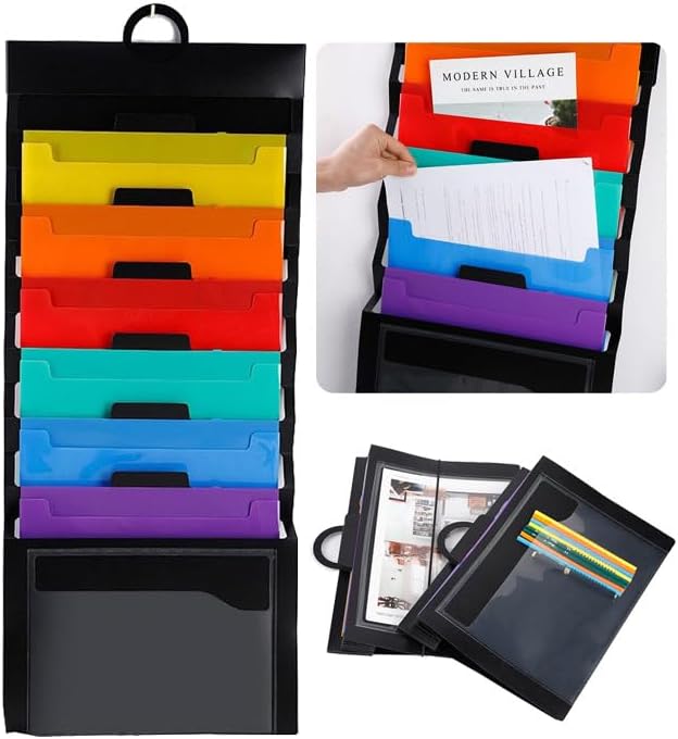 6つのポケットが繋がったマルチカラーのバインダー。 特徴は「壁に掛ける」「たたんで持ち運ぶ」という2通りの使い方ができます。 色ごとに分別して整理できるのでスッキリ片付けられます。 取り外し可能なポケットで、書類がスムーズに出し入れできます。 各ポケットには、標準的な厚さの用紙を25枚収納可能。 ついつい置きっぱなしにしそうな納品書や請求書、郵便物、チラシなどの一時保管に最適です。 壁掛けタイプですが急な来客で見られたくないときにはさっとたためるのも便利です。 壁掛け用や持ち運びに便利なに上部のフック、コンパクトに持ち運ぶためのスナップ留め、インテリアとして、持ち運ぶためあらゆる事に機能する壁掛けファイルです。