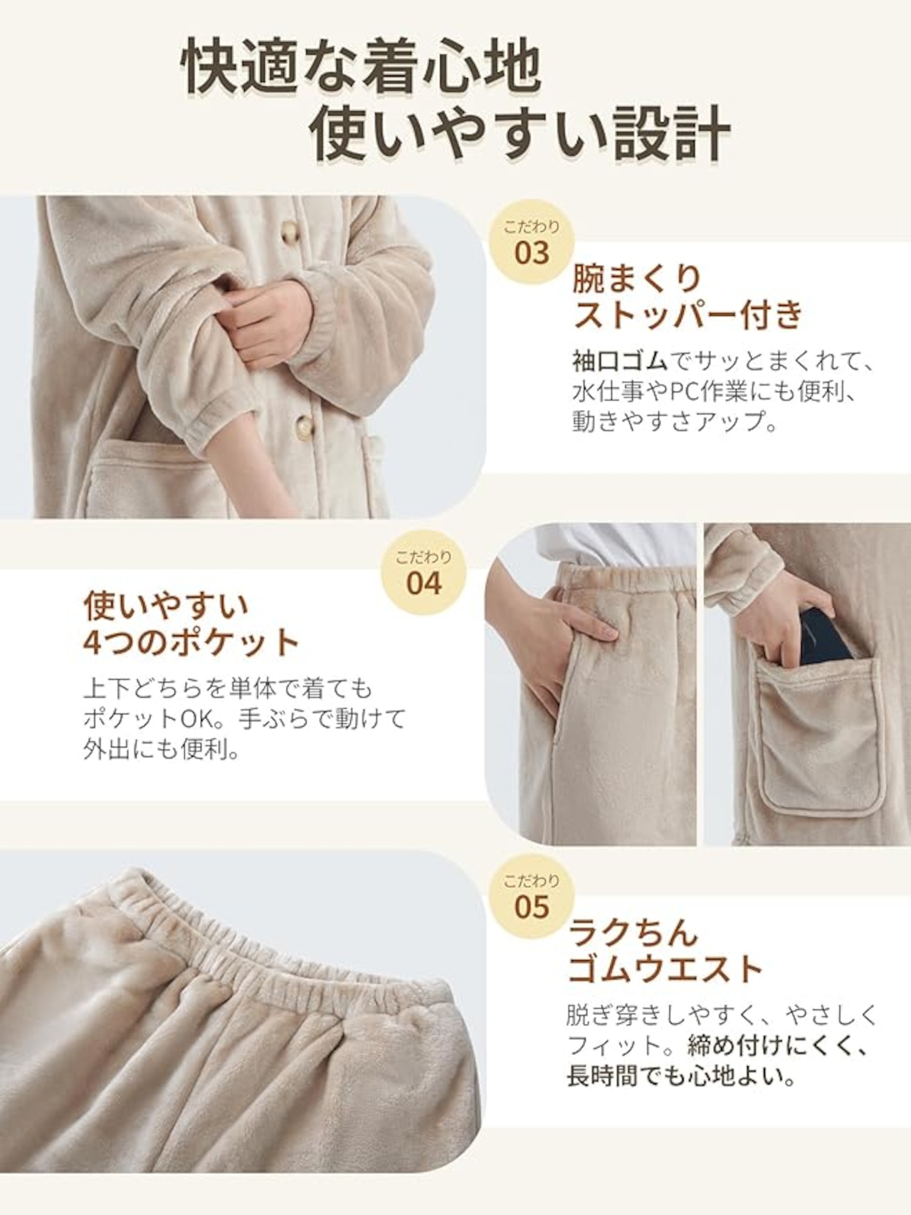 「幅広いシーンで活躍」毛布に包まれているような心地よさで、リビングや寝室はもちろん、在宅ワークや朝の支度時間など、さまざまなシーンで活用できます。動きやすくて暖かいので、暖房費の節約にもつながるアイテムです。