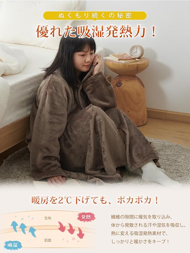【なめらか・あったかフランネル生地】軽やかでふわふわなフランネル生地を使用した着る毛布、柔らかくなめらかな肌触りを実感できます。吸湿発熱素材で保温力が高く、軽いのに暖かさをしっかりキープ、寒くなる秋冬のルームウェアとして最適です。静電気防止糸を採用するため、冬のパチパチを軽減、着心地抜群!