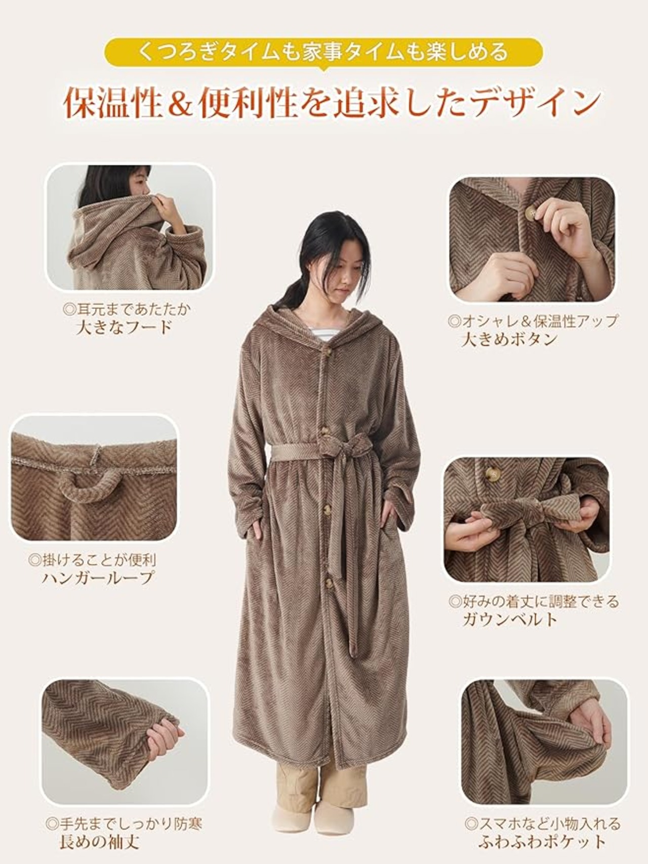 ATOKAZO 着る毛布 ルームウェア Sサイズ 男女兼用 あったか 着るブランケット 部屋着 パジャマ 腰ベルト・ポケット・フード付き ボタン付き フランネル なめらかな肌触り ふわふわ 吸湿発熱 静電気防止 防寒対策 秋冬 洗える レディース メンズ ゆったり(S-着丈120cm,ヘリンボーン・モカ)