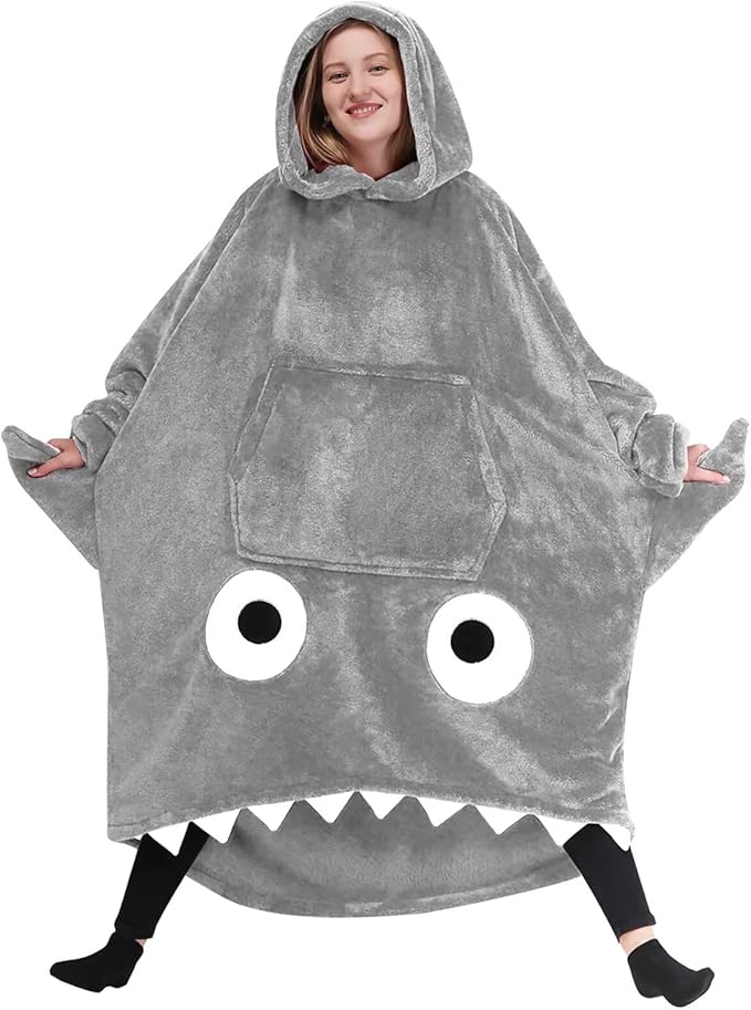[HEWEAYTA] 着る毛布 ルームウェア レディース 冬 - 着るブランケット 厚手 フード付き 長袖 ロング丈 ポケット付き もこもこ サメ 男女兼用 暖かい