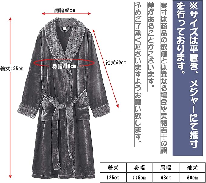 【男女兼用】◆ワンサイズ ◆着丈:125cm ◆袖丈:60cm ◆身幅:118cm ◆肩幅:48cm ◆メンズ・レディースお使い頂けるバスローブ。落ち着いた色調とシンプルなデザインで年代問わず男女兼用でペアルックにとしても幸せ感が満点で、楽な着心地でお家でのリラックスタイムにオススメです。パジャマの代わりも快眠できます。