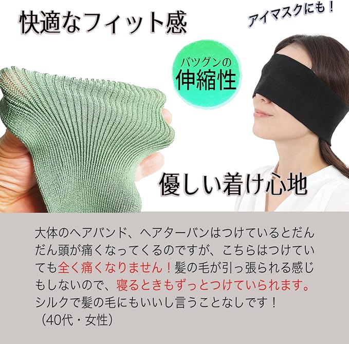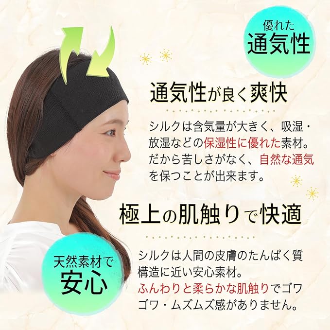 極上の肌触りで快適:天然素材で安心 シルクは人間の皮膚のたんぱく質構造に近い安心素材。ふんわりと柔らかな肌触りでゴワゴワ・ムズムズ感がありません。 本製品は全部シルクでできています。紐がないタイプなので耳の痛みを心配する必要がありません。すべて伸縮糸入りの天然繊維シルクを100%使っているので、柔らかく目や耳を覆い、耳が痛くならず快適です。