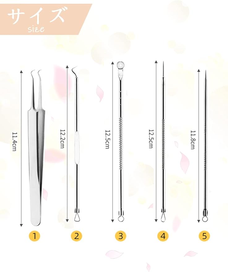 【5本セット】ニキビ取りツールは色々な用途に適しています。顔、鼻周りなどの角栓、黒ニキビ、白ニキビの除去に使用する専用スティックセットです。ニキビや黒ずみだけでなく、毛抜きとしても使用できます。