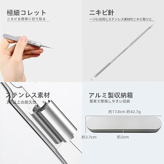 【ブラックヘッド除去 8 点セット】本製品には精密円錐形ストレート眉ピンセット1、精密円錐形スロープ眉ピンセット1、精密円錐形カーブ眉ピンセット1、収納ボックス1、にきび針1、光環リング1(含む)、孔径ロッド1、ストレート針1、ロッド針*1 が含まれています。専門的な美容ツールで、8 点セットで、サロンでのブラックヘッド除去、日常使い、DIY、精密作業に適用できます。