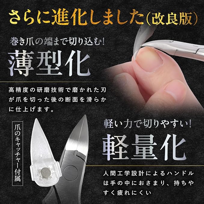 ・巻き爪専門院監修「TACHII爪切りニッパー」は、厚い爪にも対応できるプロ仕様の高精度カットを実現。巻き爪・肥厚爪・陥入爪にも対応し、手足用として高く評価されています。日本企業デザインの仕上がりで、よく切れる爪切りを探している方におすすめ。ネイルケア初心者からセルフネイル、メンズにもランキング上位。爪の弓形状にフィットし、安心して使えます。1. 巻き爪・変形爪に対応したスクエアオフカット設計・巻き爪専門院代表が推奨する「スクエアオフカット」に対応し、爪の角を丸くしすぎないようにまっすぐ切ることで巻き爪リスクを低減します。2. 少しずつ切れる精密ニッパー構造・一度に切らず「中央から左右へ少しずつ切る」ことで、爪の割れやトゲの発生を防ぎます。3. 高硬度ステンレス製の鋭利な刃・厚い爪や硬い爪もスムーズに切断。衛生的でサビにも強く、長く使えるプロ仕様。4. 正しいセルフケアを支える付属ツール・ゾンデ(爪裏の汚れ・巻き爪の溝を優しく整える)・爪やすり(断面をなめらかに仕上げる)・飛散防止カバー(爪の破片が飛び散らず清潔)