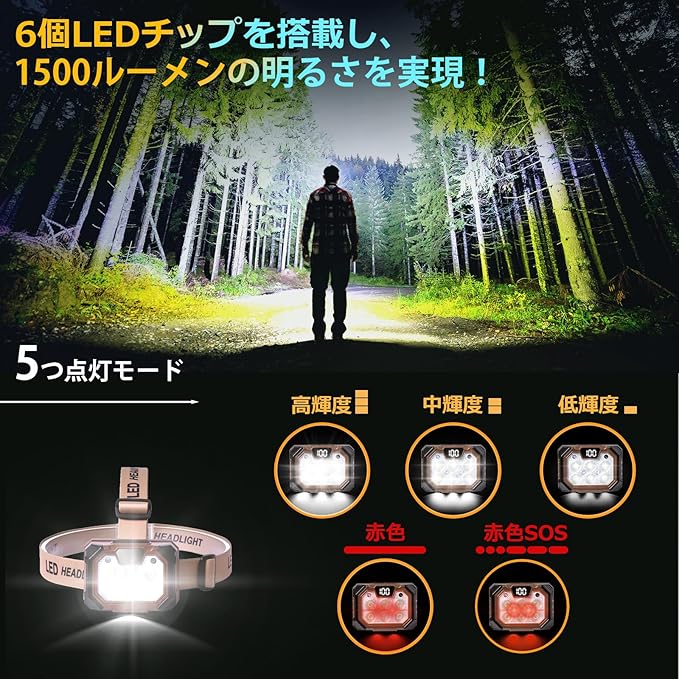 【高輝度ヘッドランプ】Yoobaoヘッドライトは6個LEDチップを搭載し、全光束でルーメンが1500lmを達し、明るくてきれいな光色を提供します。光を無闇の空に散らずに照明したい場所をしっかり照らします。用途に応じて選べる5つの点灯モードを搭載。電源ボタンを押すと昼白色(強)、昼白色(中)、昼白色(弱)、赤いライト、赤い点滅ライトのモードを切替できます。