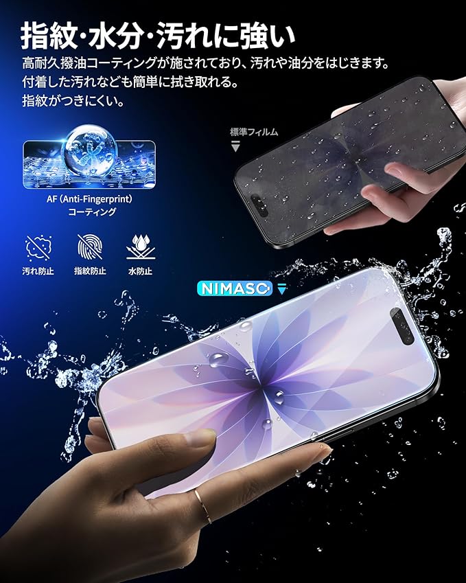 「指紋防止・滑らかな触り心地」本製品は撥水撥油のAF(Anti-Fingerprint)コーティング加工とスムーズタッチ加工により、指紋や汚れがつきにくく、油分や水分が強く付着した汚れや指紋がついても、拭き取るだけで綺麗になります。また、手触りも滑らかで、毎日の動画視聴や仕事、勉強、ゲームなどのあらゆるシーンでも、常に美しいアイホン17の画面をお楽しみいただけます。