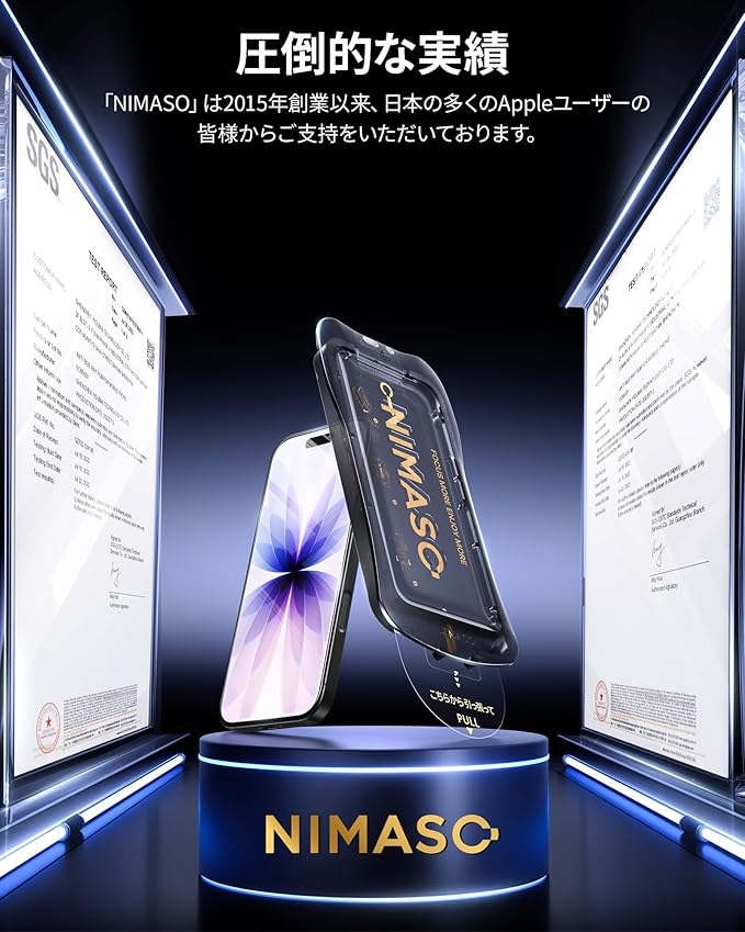 「2ステップ貼付・自動除塵」NIMASO最新の自動除塵ガイド枠が登場!!!被せる、引っ張る、たった2ステップで驚くほど簡単な貼り付け作業ができます!さらに画期的なのが、内蔵された静電式自動除塵構造。ホコリやゴミを自動的に吸着除去するので、貼り付け時の失敗が大幅に軽減します。初めての方でもストレスなく、キレイに貼れるのが特長です。もう気泡やズレに悩まされることはありません!