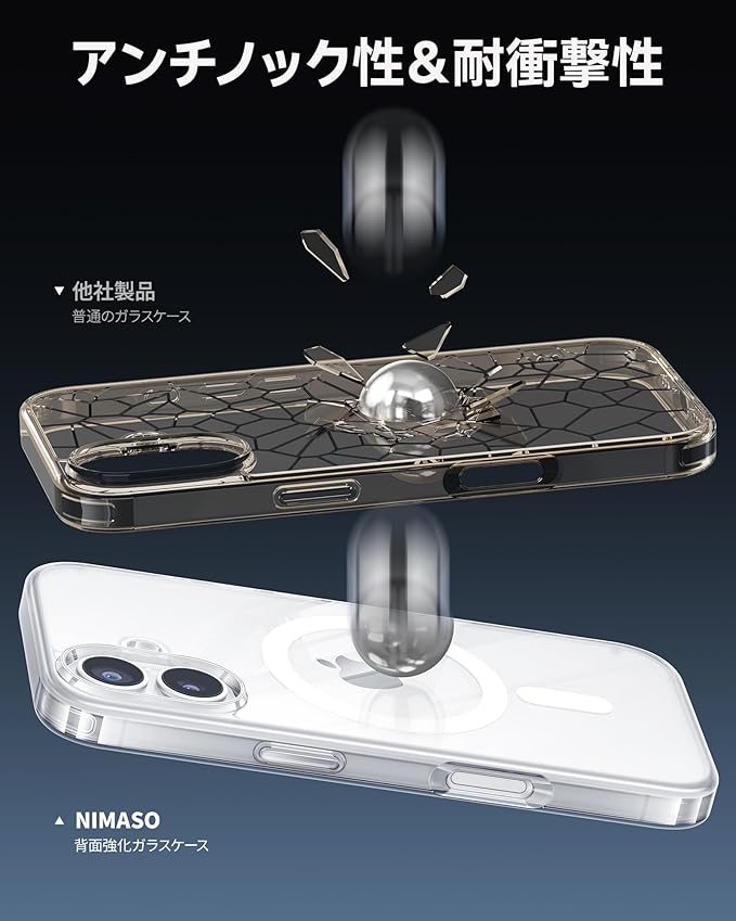 NIMASO iPhone 17 用 ケース MagSafe対応 クリア 背面 強化ガラス 9H硬度 米軍MIL規格 SGS認証 傷つけ防止 耐衝撃 透明 薄型 バンパー 黄変防止 マグネット搭載 マグセーフ対応 保護カバー ワイヤレス充電対応 ストラップホール付き アイフォン17対応(6.3インチ)スマホケース(氷晶シリーズ) NSC25F1626